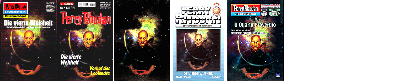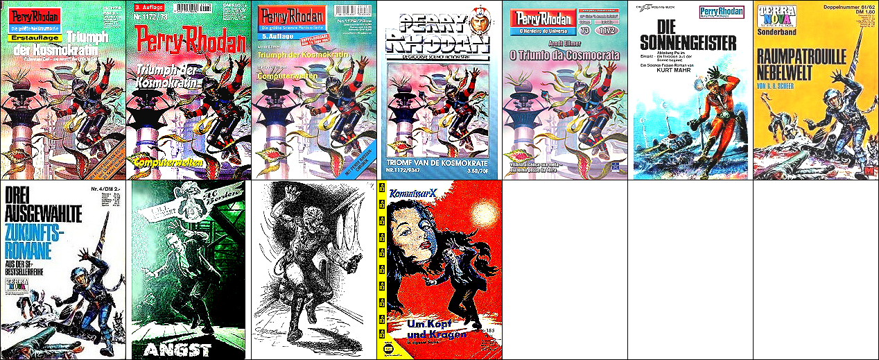 sehr ähnliche Körperhaltung, 1 - 5 gleiches Bild, 7 - 8 gleiches Bild mit überarbeitetem Hintergrund, 10 gleiche Körperhaltung, aber mit Kopf eines Außerirdischen, schwarzweiß und seitenverkehrt |