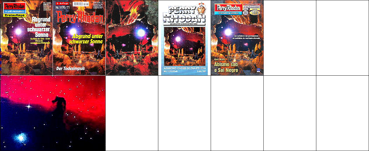 1 - 5 gleiches Bild, 3 seitenverkehrt, der Hintergrund zeigt den Pferdekopfnebel im Sternbild Orion (man beachte die Sternkonstellationen neben dem hell leuchtenden Stern) |
