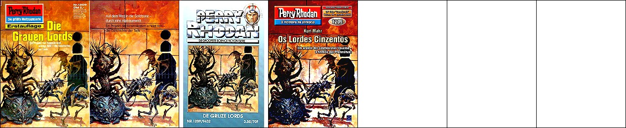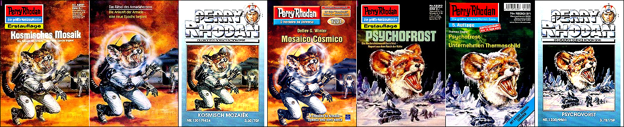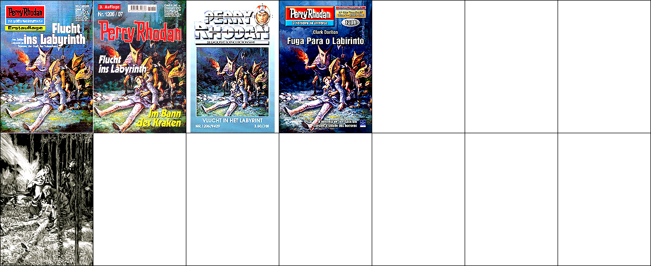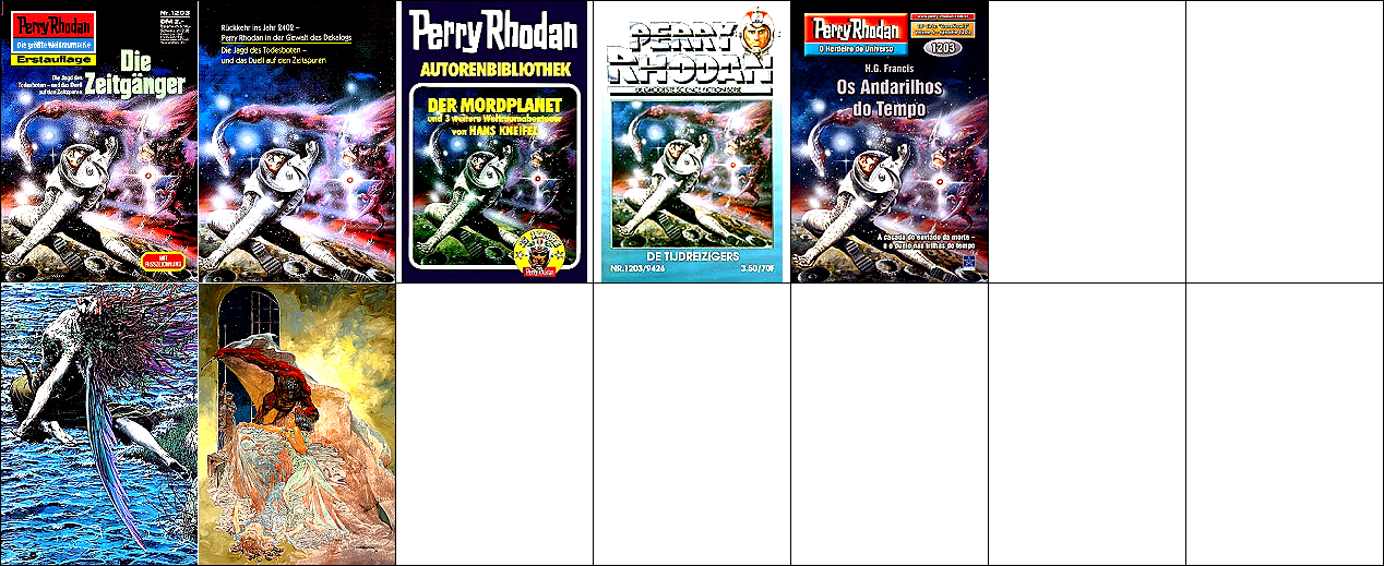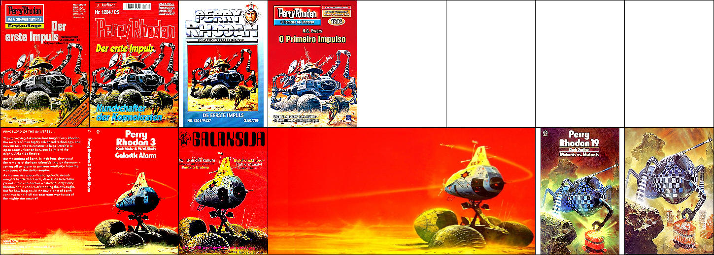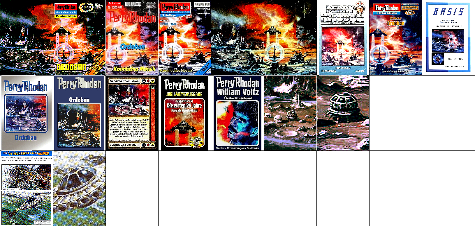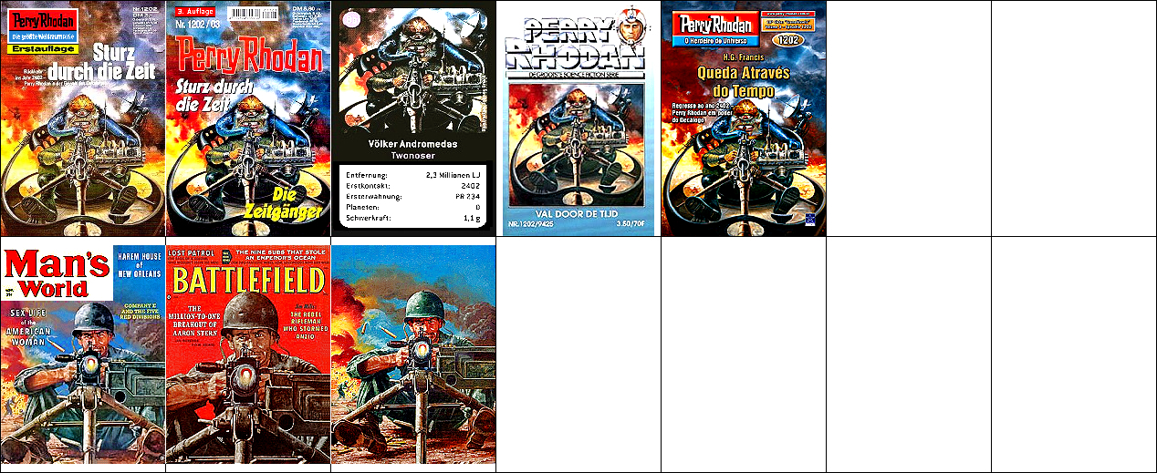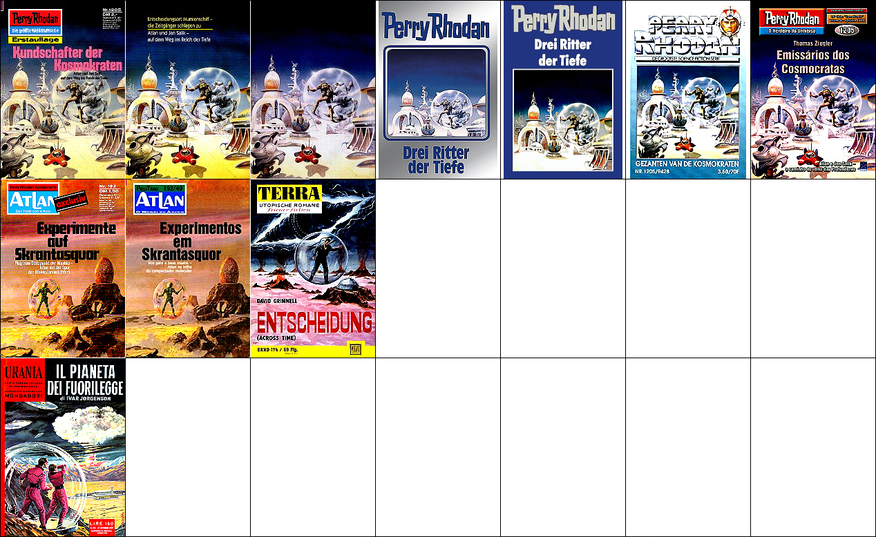 1 - 7 gleiches Bild, 8 - 12 unterschiedliche Ausschnitte des doppelseitigen Titelbildes, das Oberteil der Kuppelstation auf dem Mond ist von 15 inspiriert |
