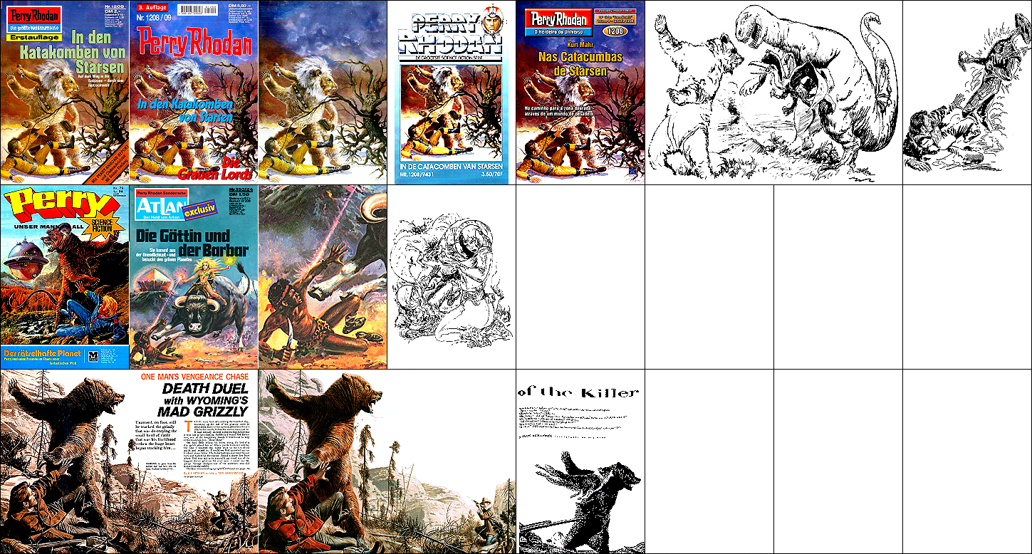 1 - 5 gleiches Bild, der Bär in 6 und der Mann in 7 haben die gleiche Körperhaltung wie in 1, in 8 tauchen beide seitenverkehrt auf, in 9 und auch in 11 ist der Mann Nebenfigur, 15 bzw. 16 ist das Vorbild für die Nachzeichnungen, wobei der dortige Bär seinerseits von 17 nachgezeichnet ist |