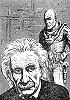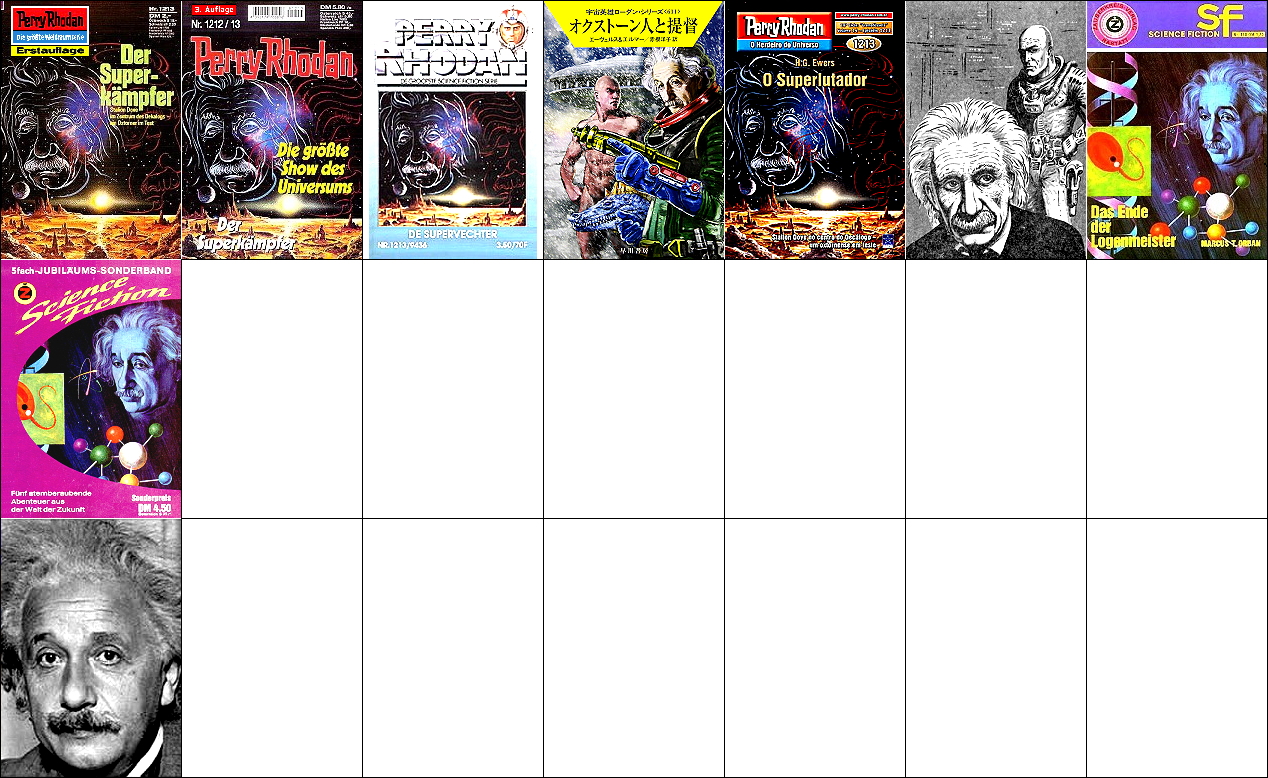 Einstein-Konterfei in Bilder eingebaut, 1 - 3 gleiches Bild, 4 Neuinterpretation für japanische Ausgabe, 6 - 7 gleiches Bild |