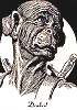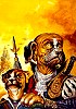 Hundeartiger Außerirdischer mit kurzer Schnauze und Schlappohren (Abaker) legt Kollegen die Hände auf die Schultern, siehe auch
