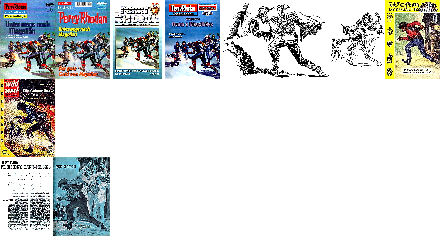 1 - 4 gleiches Bild, die Männer in 5 und 7 sowie der Roboter in 6 haben die gleiche Körperhaltung, 8 ähnliches Motiv mit etwas anderer Haltung des linken Armes, 15 Vorbild für Nachzeichnungen |