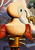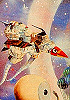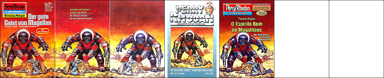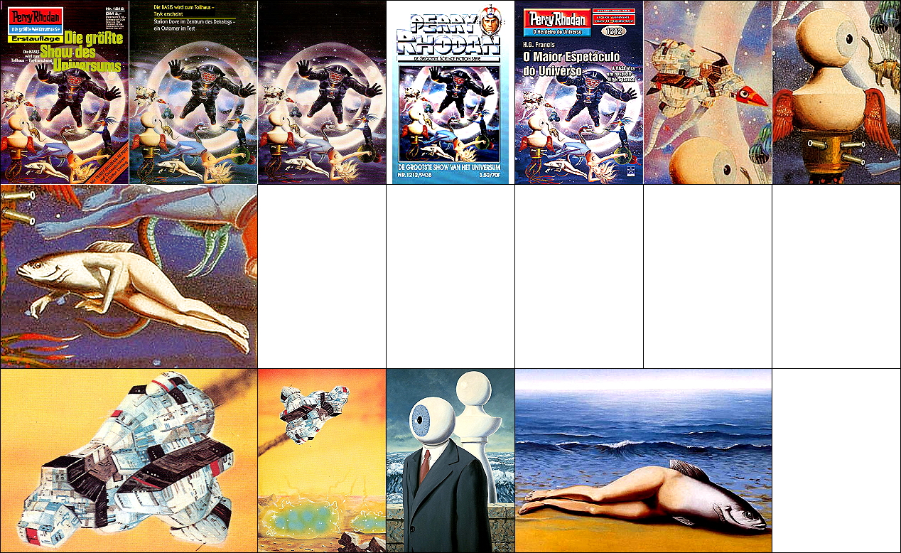 1 - 5 gleiches Bild, der interstellare Vogel links im Bild ist von 15 übernommen und aus einem Raumboot verwandelt, die kegelförmige und die fischförmige Gestalt im unteren Bildbereich sind von den 2 Gemälden des französischen Surrealisten René Magritte in 17 und 18 nachgezeichnet |