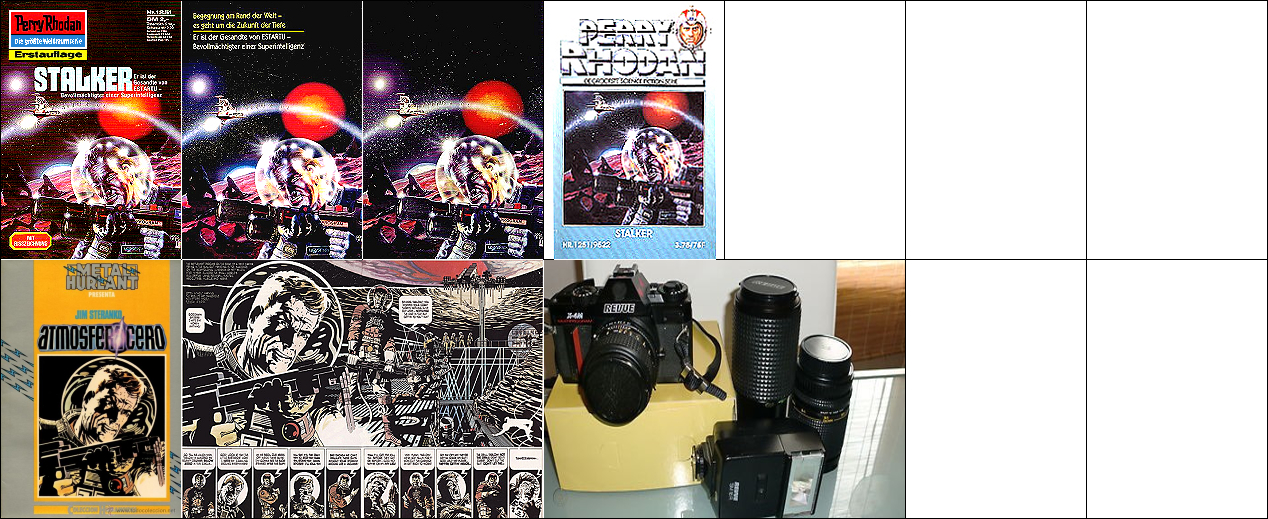 1 - 4 gleiches Bild, der Raumfahrer ist von 8 bzw. 9 nachgezeichnet, die Visiereinrichtung seiner Waffe hat das Teleobjektiv einer Revue-X-4M-Kamera übernommen, aber aus einem anderen Foto als Bild 10 |