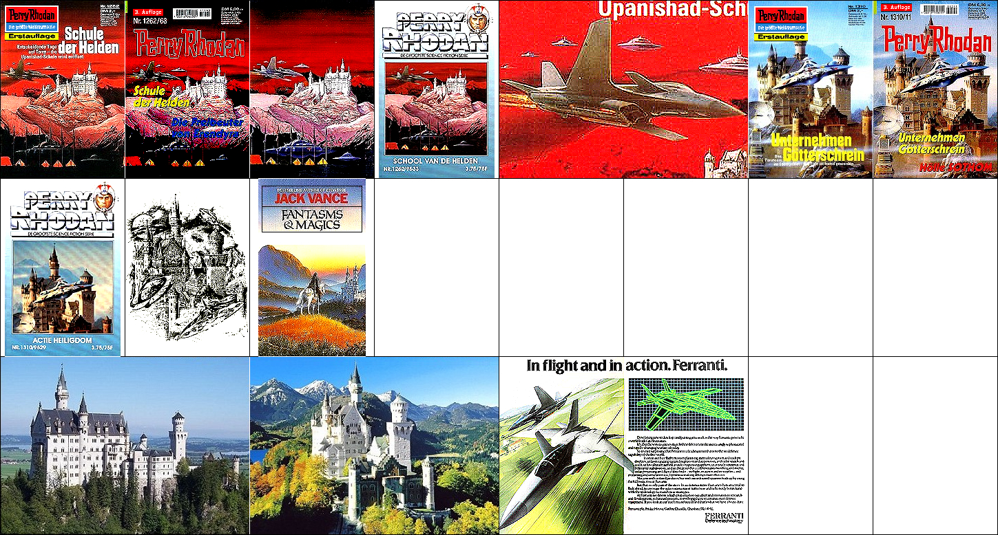 ähnliche Motive mit unterschiedlicher Perspektive, 1 - 4, 6 - 8 gleiches Bild, Vorlage für das Schloss ist Neuschwanstein in den Allgäuer Bergen, der Jetjäger links oben in 1 hat sein Vorbild in 17 |