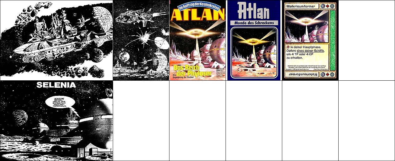 das gleiche Schiffsmodell findet sich auch in 2, auch die kugelförmigen Segmente der Mondstation in 3 sehen gleich aus, 3 - 5 gleiches Bild, 8 Vorbild für Nachzeichnungen |