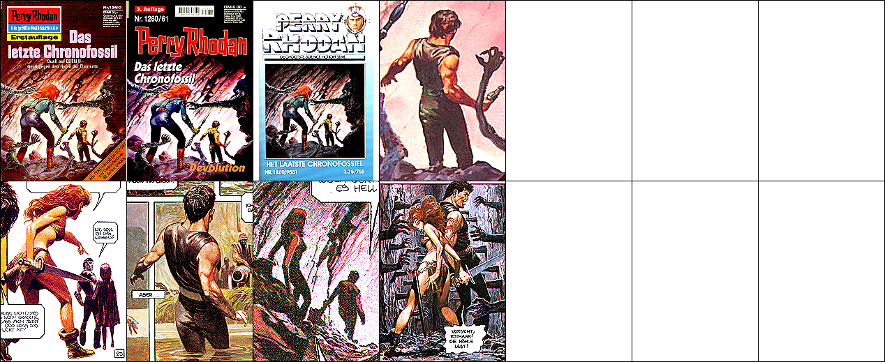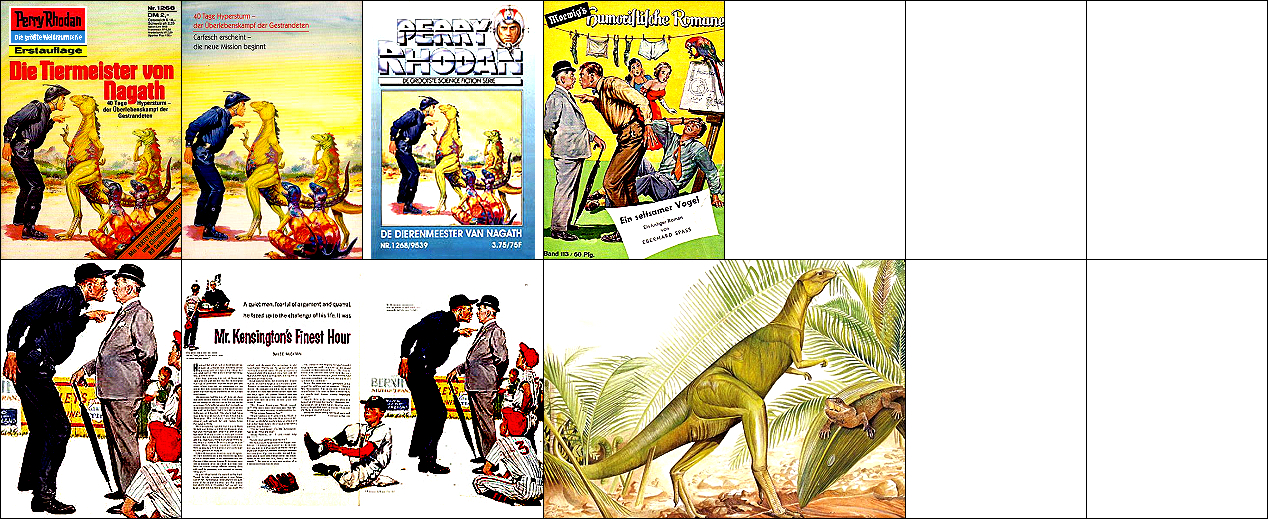 1 - 3 gleiches Bild, in 4 kommt die gleiche Szene vor und ist von 8 nachgezeichnet, in 1 ist aber der zweite Mann vom Fabrosaurier in 9 inspiriert |