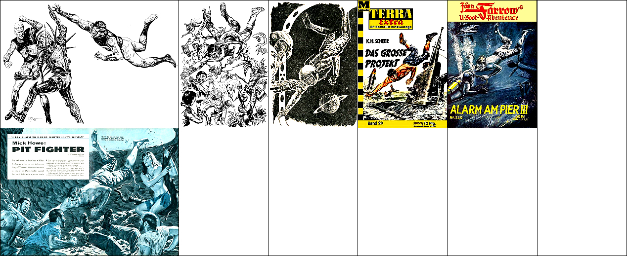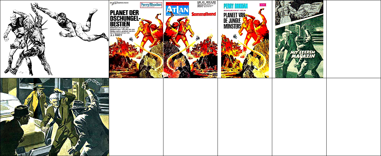 der linke Terraner und der Außerirdische haben die gleiche Körperhaltung, 2 - 4 gleiches Bild, seitenverkehrt, der Außerirdische ist hier durch einen Menschen ersetzt, 8 Vorbild für Nachzeichnungen |
