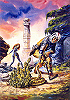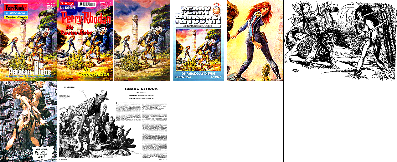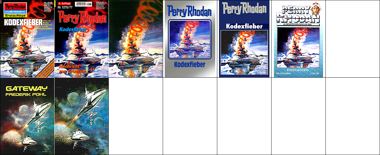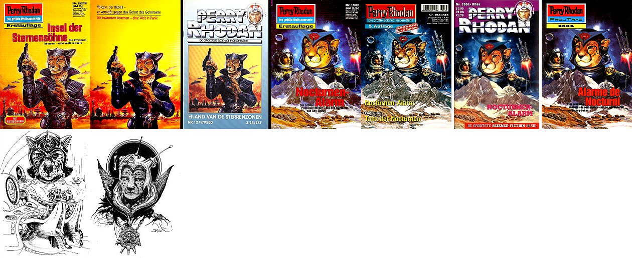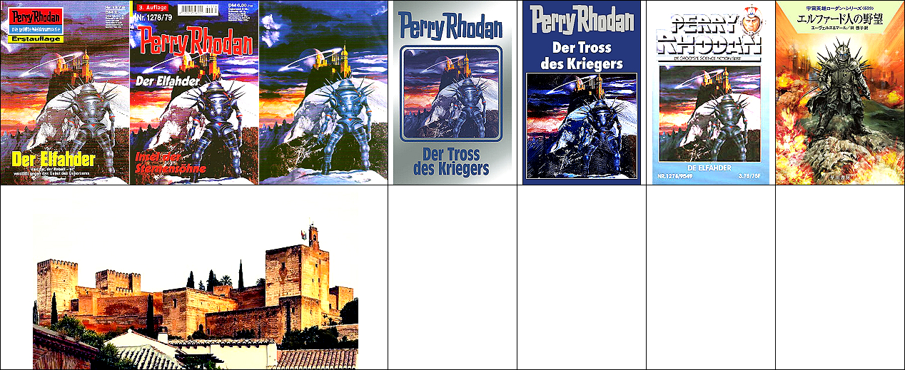 1 - 6 gleiches Bild, 7 Nachzeichnugn des Außerirdischen für japanische Ausgabe, die Burg auf der Bergspitze ist die Alcazaba, die Zitadelle der Alhambra, welche für das Titelbild mit Kuppeln ergänzt worden ist |