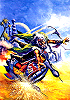 bärtiger Mann mit Umhang stürzt von kleinem Gefährt |