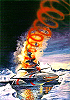 brennendes Raumboot im Wasser zwischen Eisschollen |