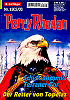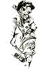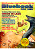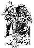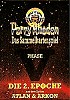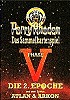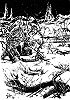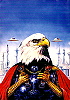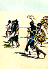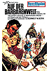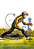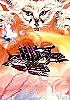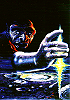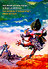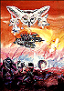 fliegende Frauengestalt über Szenerie mit 2 Kämpfern und fuchsartigen Außerirdischen |