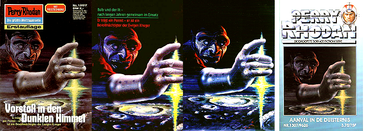 1 - 3 gleiches Bild, das Raumschiff auf der Rückseite des doppelseitigen Bildes dürfte vom Schiff aus dem Film "Black Hole" inspiriert sein |
