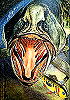 Szenerie mit Fischen, darunter ein Raubfisch mit offenem Maul, siehe auch