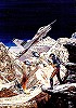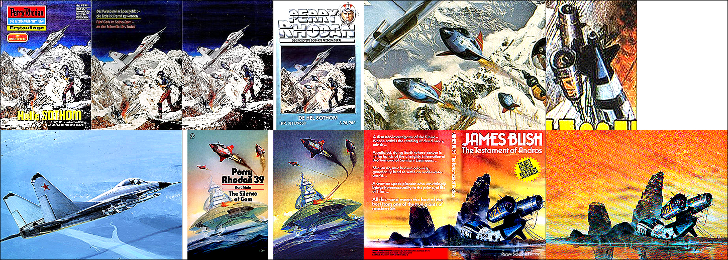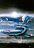 1 - 4 gleiches Bild, der Kampfjäger dürfte eine MIG-29 Fulcrum sein, die 3 kleinen Raumboote im Hintergrund sind wahrscheinlich von 9 bzw. 10 nachgezeichnet, das abstürzende Raumboot unten ist von 11 bzw. 12 entnommen |
