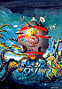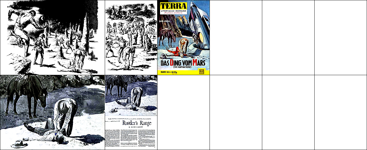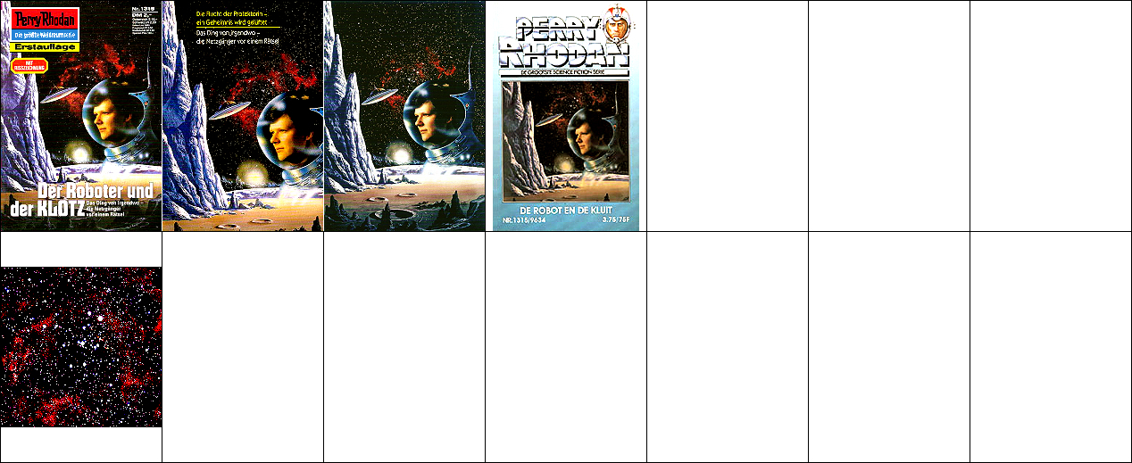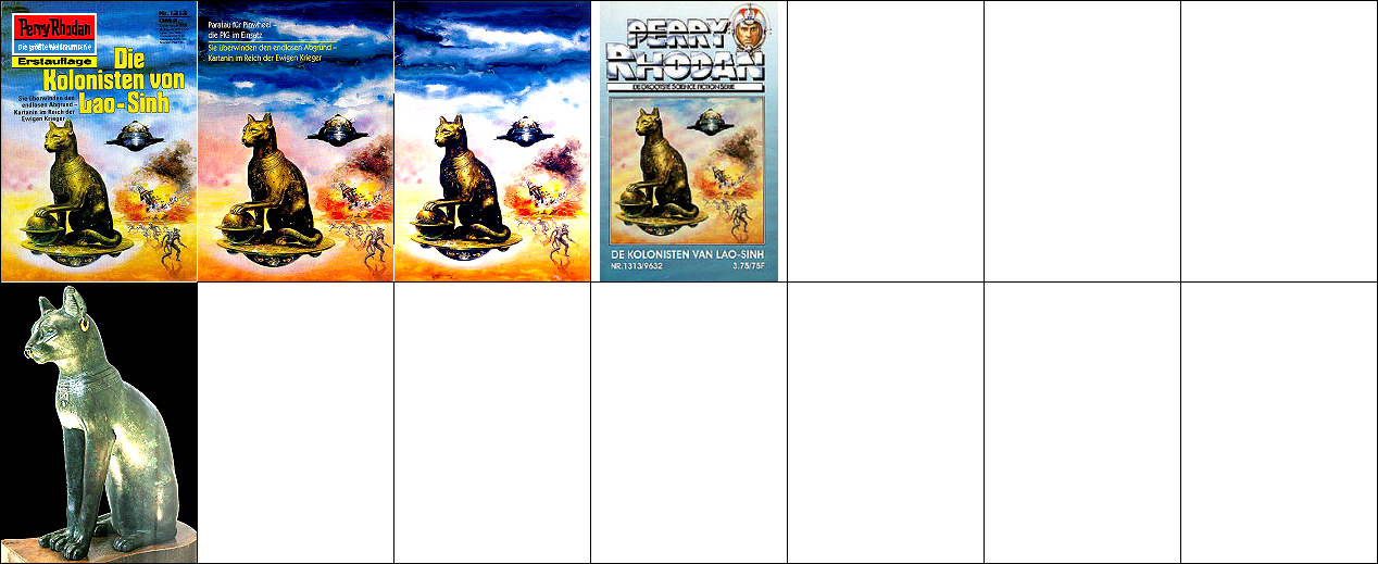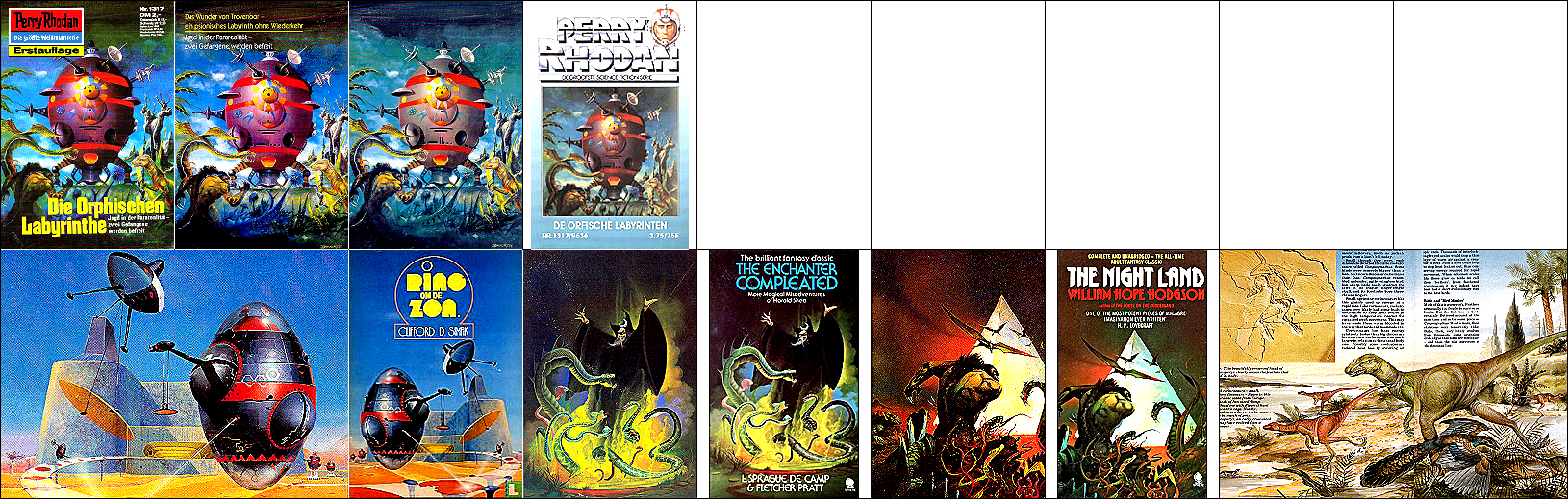 1 - 4 gleiches Bild, das Raumschiff ist von 8 bzw. 9 inspiriert, die aufgerichteten Schlangen von 10 bzw. 11, der Außerirdische links unten von 12 bzw. 13 und der Saurier rechts von 14 |