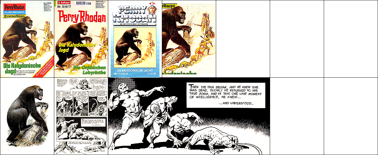 1 - 3 gleiches Bild, der Gorilla ist von 8 nachgezeichnet, die Figuren rechts davon in unterschiedlichen evolutionären Entwicklungsstufen von 9 |