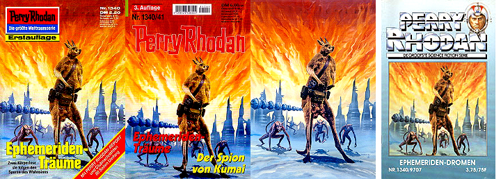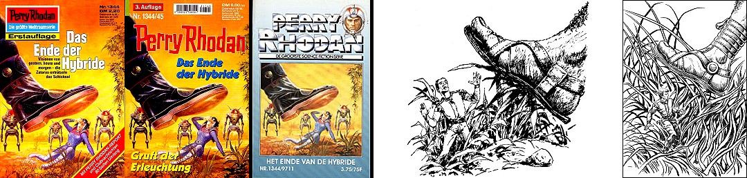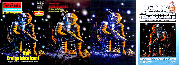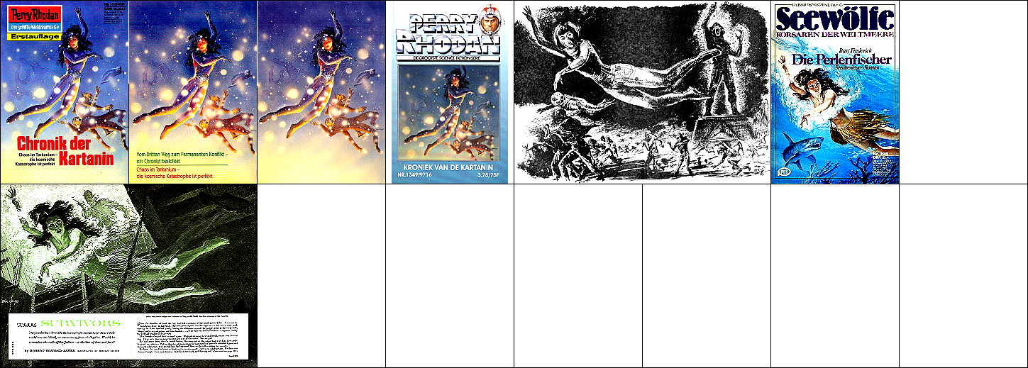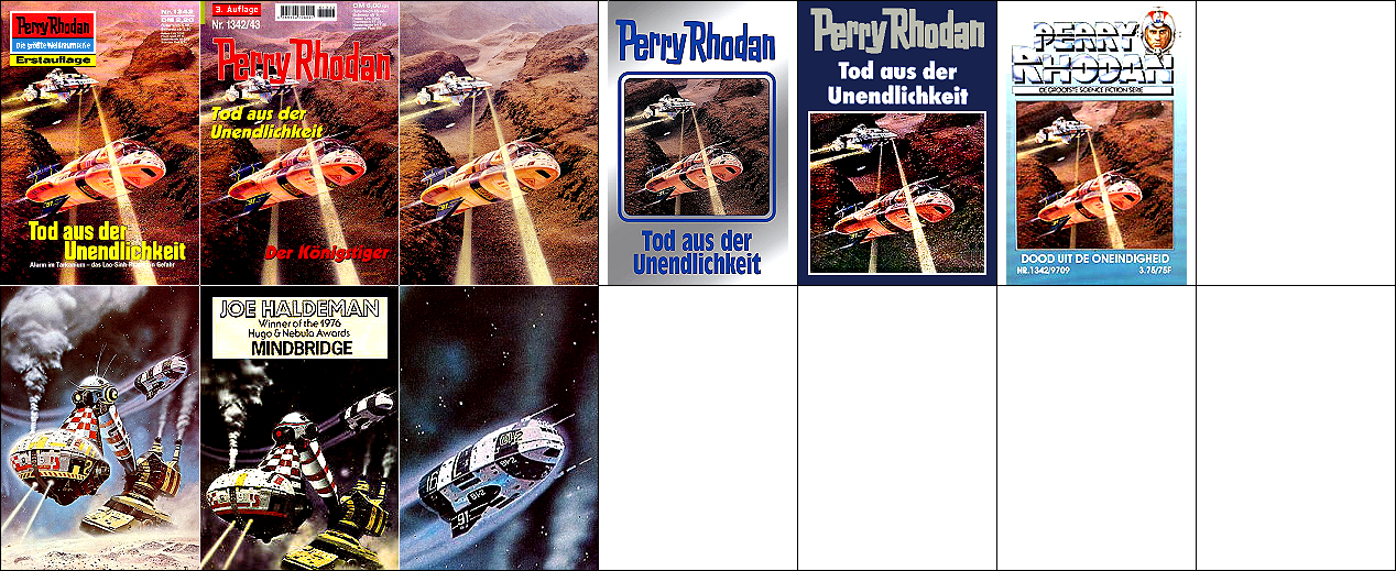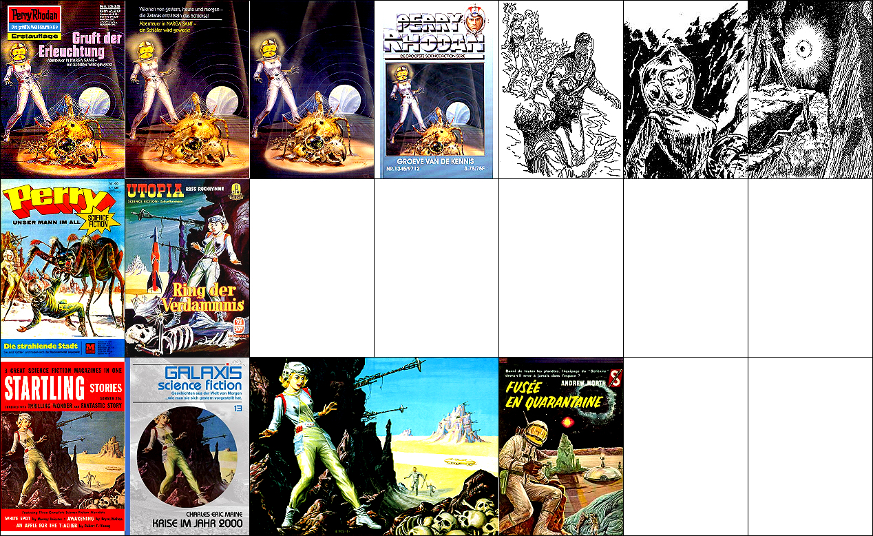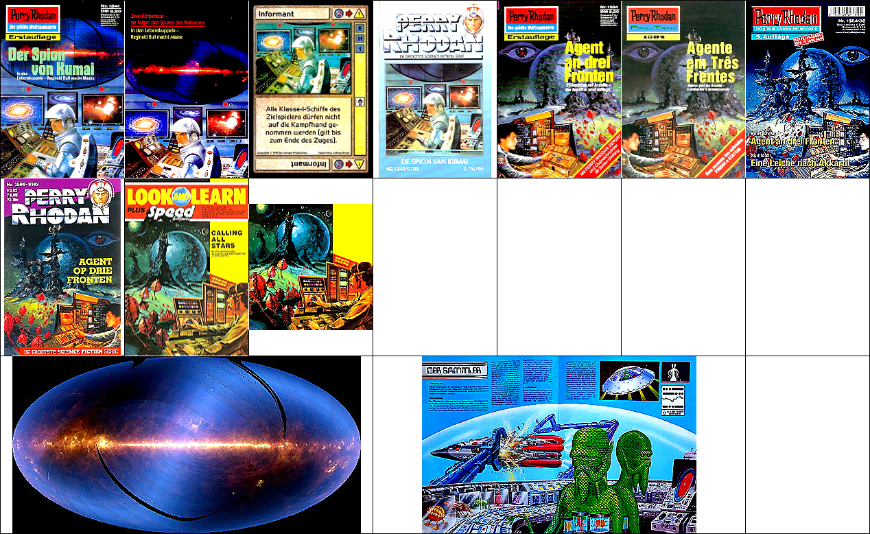 ähnliche Motive, 1 - 4, 5 - 8 gleiches Bild, 7 - 8 gespiegelt, 9 - 10 gleiches Bild, sehr ähnlich, aber nicht das Vorbild (1 und 5 sind Collagen mit einer ähnlichen Vorlage), die Darstellung der Milchstraße von der Kante im oberen Bereich von 1 ist von 15 entnommen, das Gerät mit dem roten kreisförmigen Bildschirm rechts von 16 |