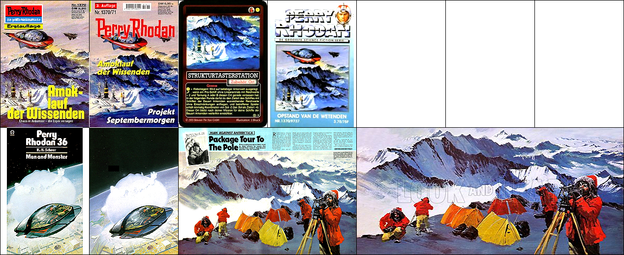 1 - 4 gleiches Bild, 3 Ausschnitt, das Raumboot dürfte von 8 bzw. 9 inspiriert sein, die Berge sind von 10 bzw. 11 nachgezeichnet und zeigen eine Gebirgskette in der Antarktis |