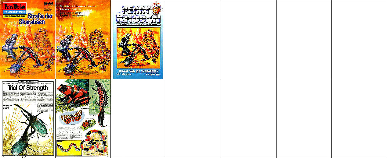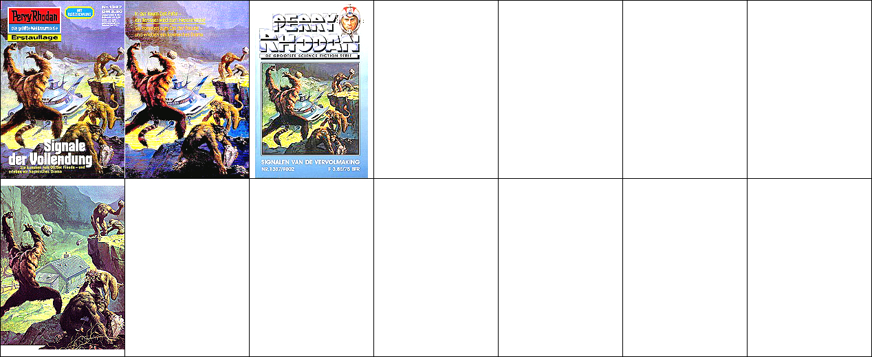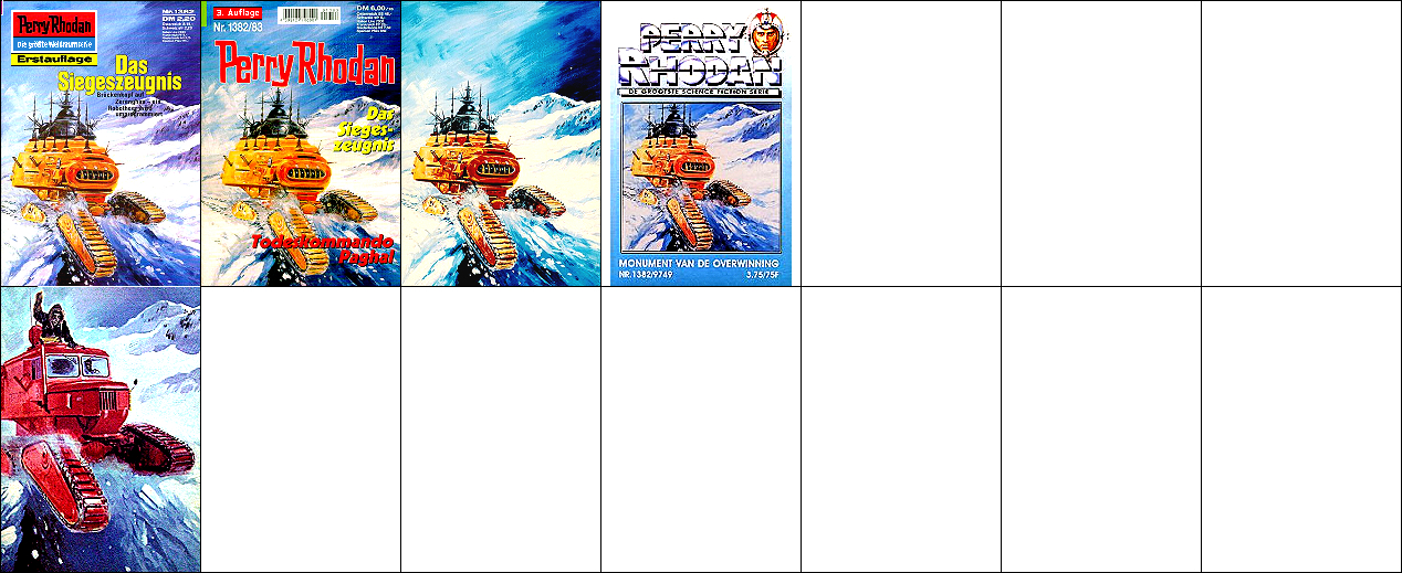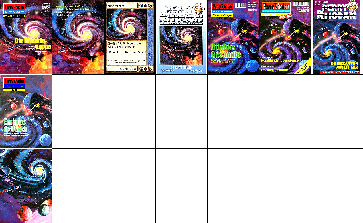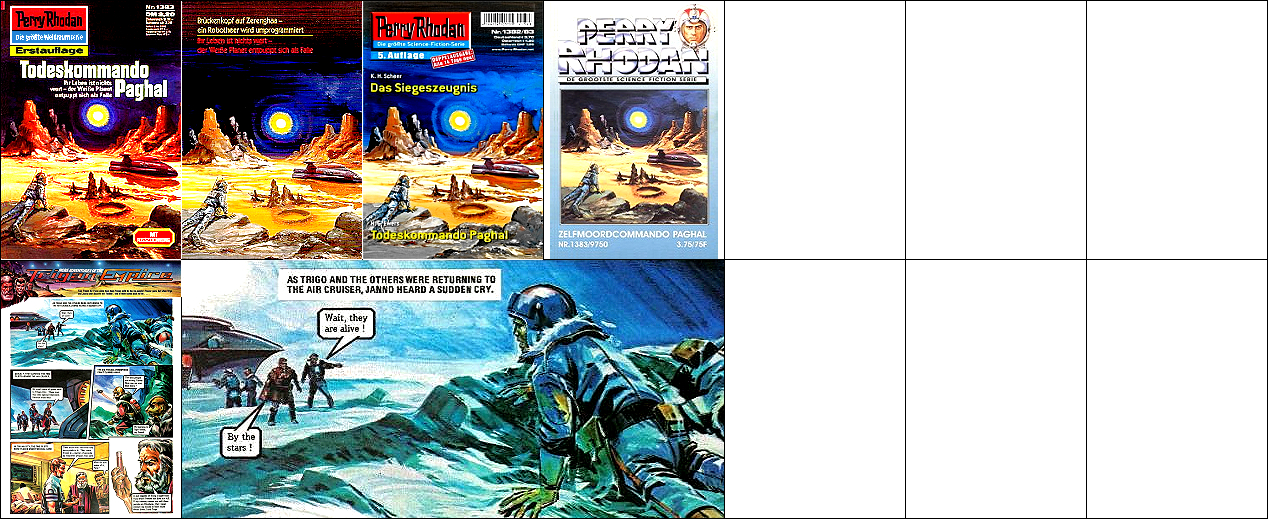 sehr ähnliche Perspektive, seitenverkehrt, 1 - 3, 4 - 6 gleiches Bild, 8 bzw. 9 Vorbild für 4, das explodierende Kugelraumschiff in 4 ist von 10 nachgezeichnet, 10 - 12 gleiches Bild |