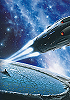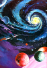 Raumschiff vor Galaxis mit verschiedenfarbigen Spiralarmen |
