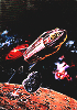 Mensch und 2 Außerirdische, dahinter Raumboot vor Mond |