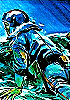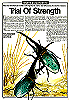 kniender Terraner vor Nashornkäfer, der Lurch in die Zange nimmt |