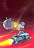 Walzenraumschiff über Planet von schräg vorn |