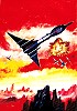 schlankes Raumschiff mit Deltaflügeln vor Explosionen |