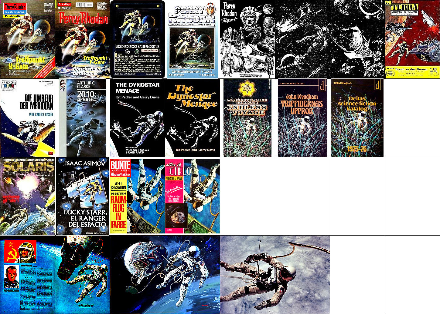 1 - 4, 10 - 11, 12 - 14, 17 - 18 gleiches Bild, 22 Vorlage für den Raumfahrer in allen Bildern, wobei dieser teilweise als Collage eingebaut und teilweise nachgezeichnet wurde, 23 sehr ähnliches Motiv, 24 dürfte die reale Vorlage für die Bilder sein |