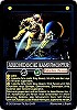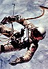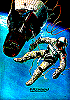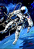 fliegender Raumfahrer mit spiegelndem Helm, Tornister vor der Brust und angewinkelten Beinen, siehe auch
