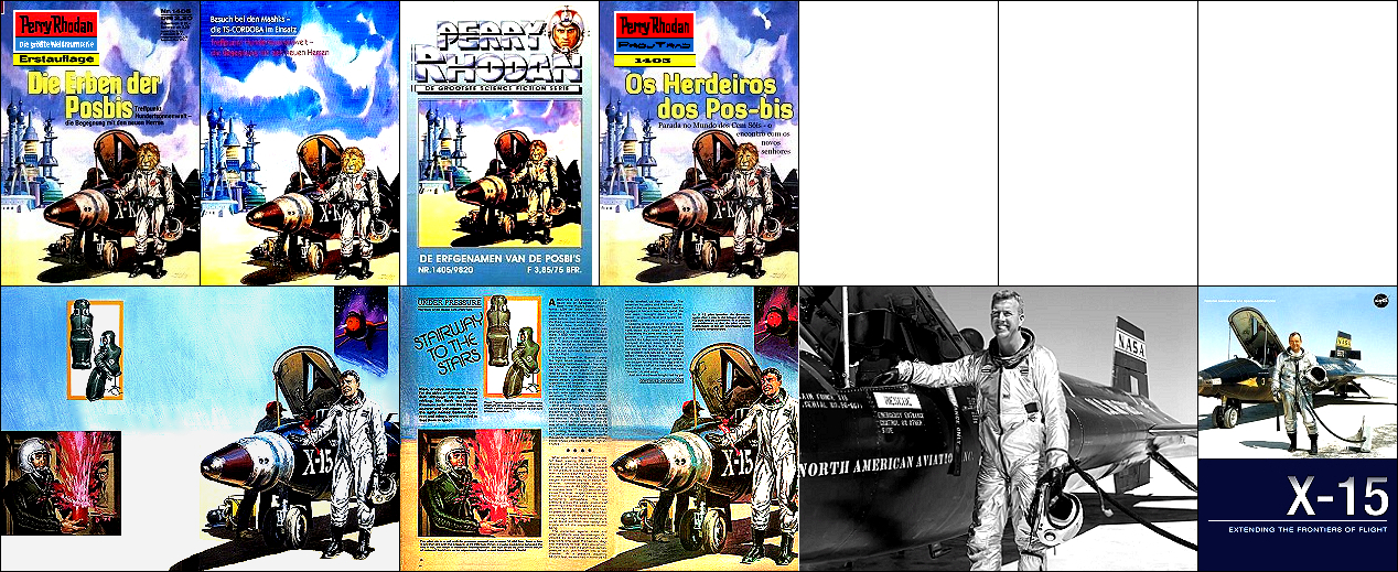 1 - 4 gleiches Bild, von 8 bzw. 9 übernommen und mit Löwenkopf übermalt, für das Bild haben die Fotos in 10 und 11 des amerikanischen Raketen-Experimentalflugzeugs X-15 als Vorlage gedient |