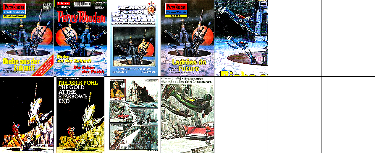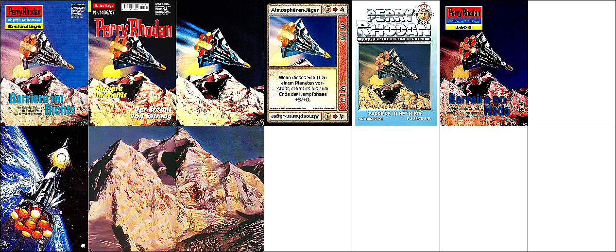 1 - 6 gleiches Bild, 4 Ausschnitt, das Raumschiff ist von 8 übernommen und leicht ergänzt, in 7 hat identische Triebwerksdüsen, das Felsmassiv im Hintergrund ist aus 9 entnommen |
