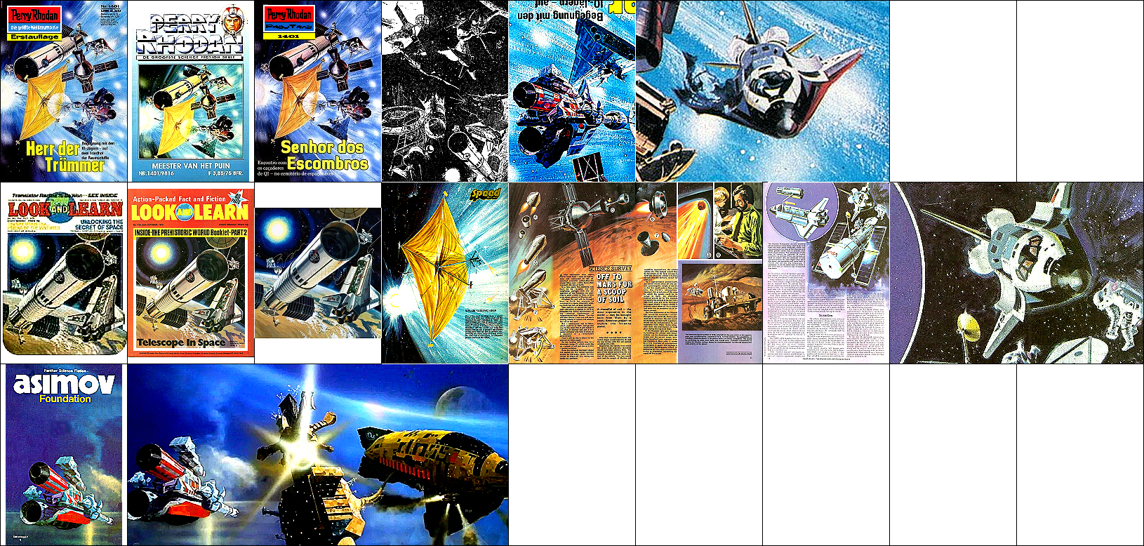 1 - 5 gleiches Bild, doppelseitig, 3 Ausschnitt aus Rückseite, 4 nur Rückseite, 6 Raumboot gleich wie in 1,in 7 findet sich ein sehr ähnlicher Ringplanet, 8 - 11 sind mögliche Vorbilder für Nachzeichnung Raumboot, 8 - 10 gleiches Bild, gezeigt wird ein Raumboot aus dem Film "2001 - Odyssee im Weltraum", die Fahrzeuge links sind von 13 nachgezeichnet, das Fahrzeug in der Bildmitte von 15, der Ringplanet ist von 17 nach-gezeichnet sowie die Forscher mit den Messinstrumenten von 18 |