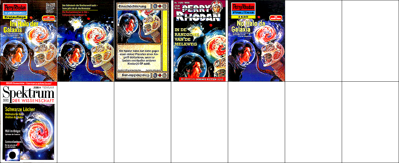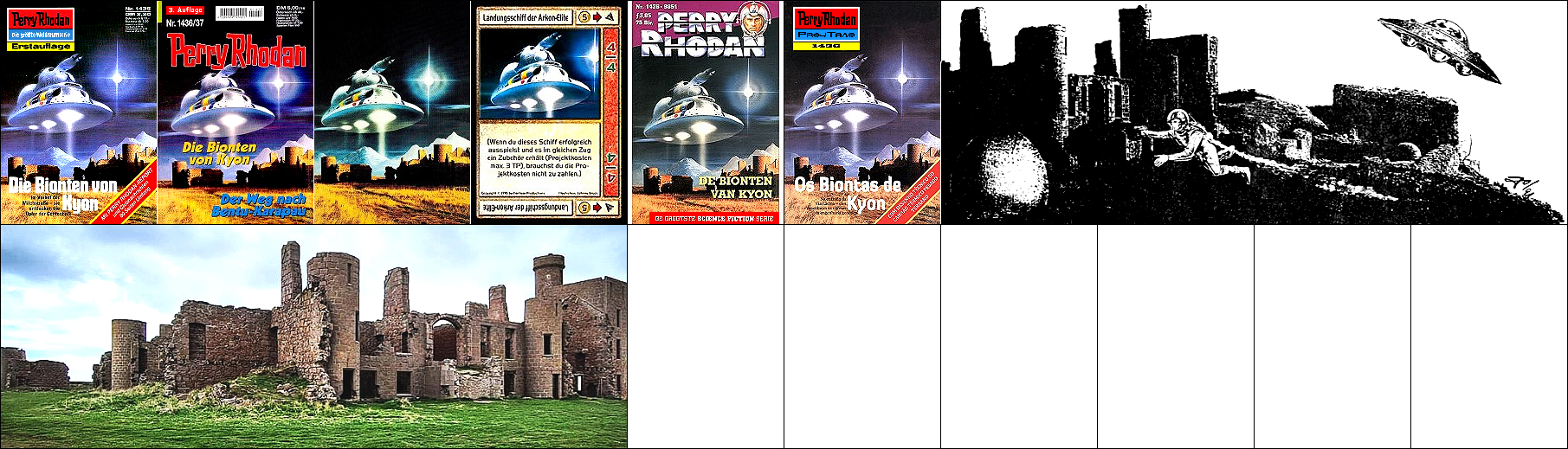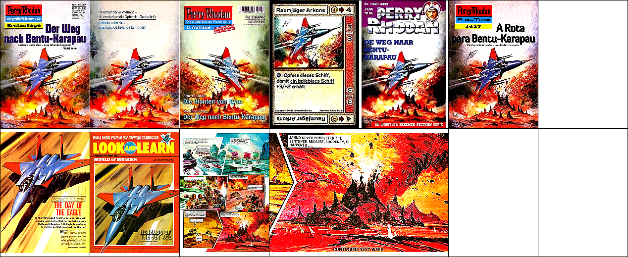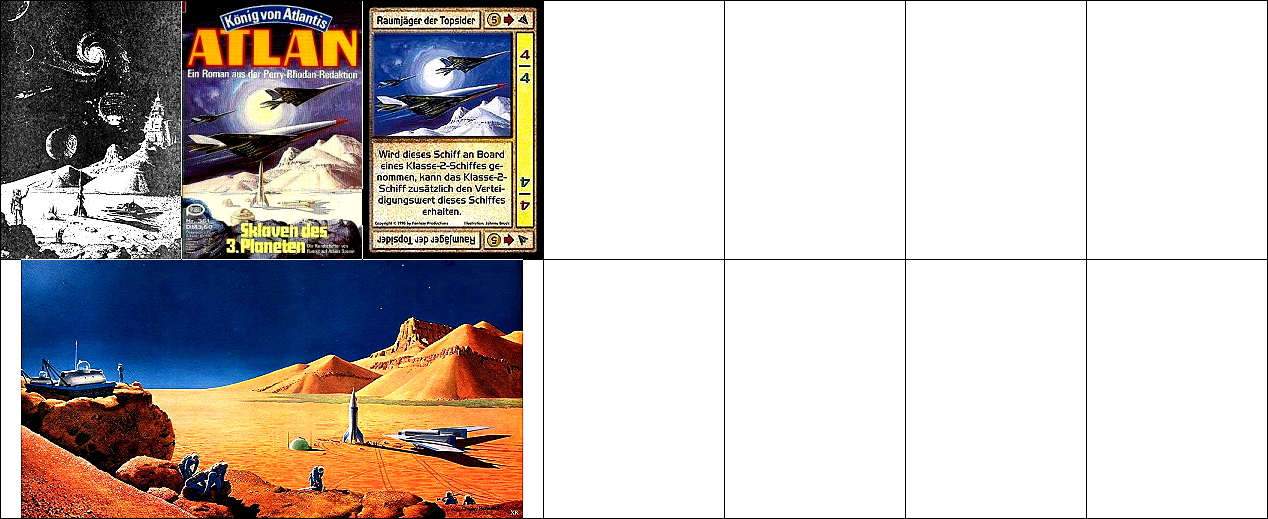 1 - 6 gleiches Bild, 3 seitenverkehrt, der Raumjäger zeigt einen McDonnel-Douglas F-15 Jet und ist gedreht und seitenverkehrt von 8 bzw. 9 übernommen, das Hintergrundmotiv ist von 10 nachgezeichnet |