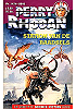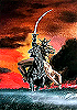Reiter auf gehörntem Tier gegen Flugwesen |