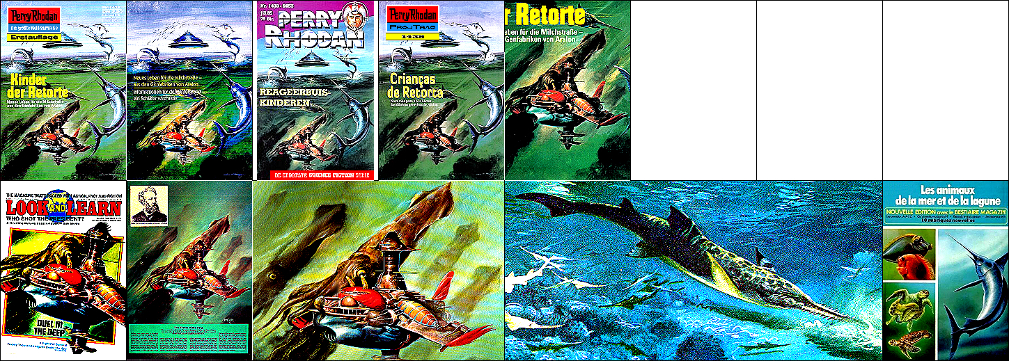 1 - 4 gleiches Bild, das Tauchboot und der dahinter befindliche Kalmar sind von 8 übernomment, 8 - 10 gleiches Bild, der leider durch den Bandtitel verdeckte Sägefisch von 11 und der springende Schwertfisch von 12 |