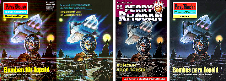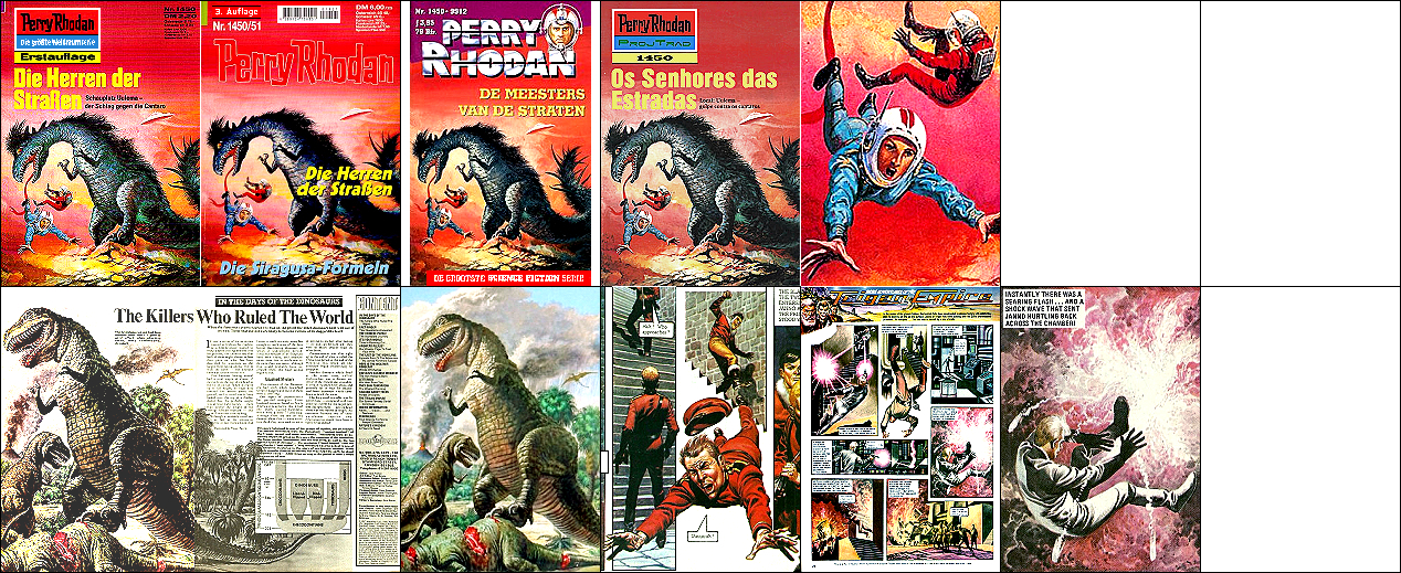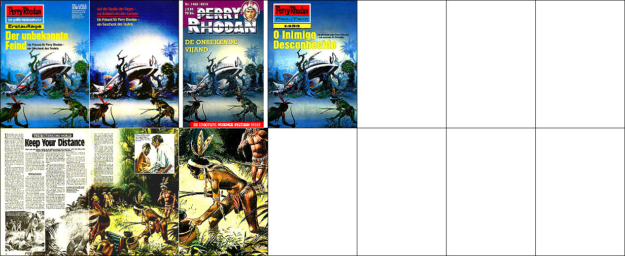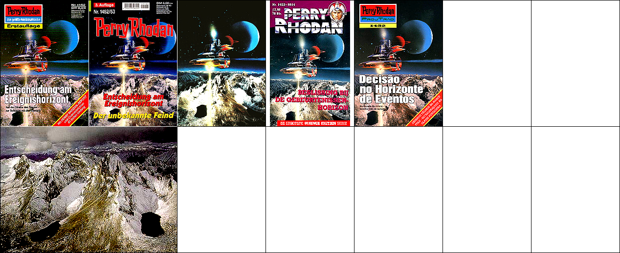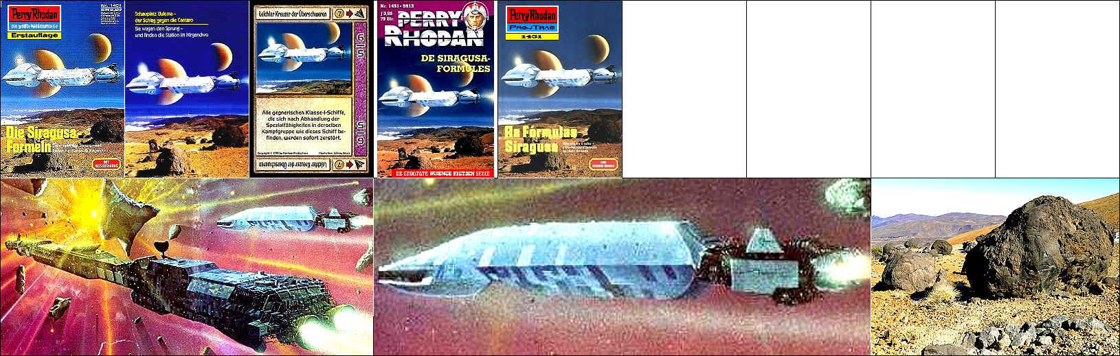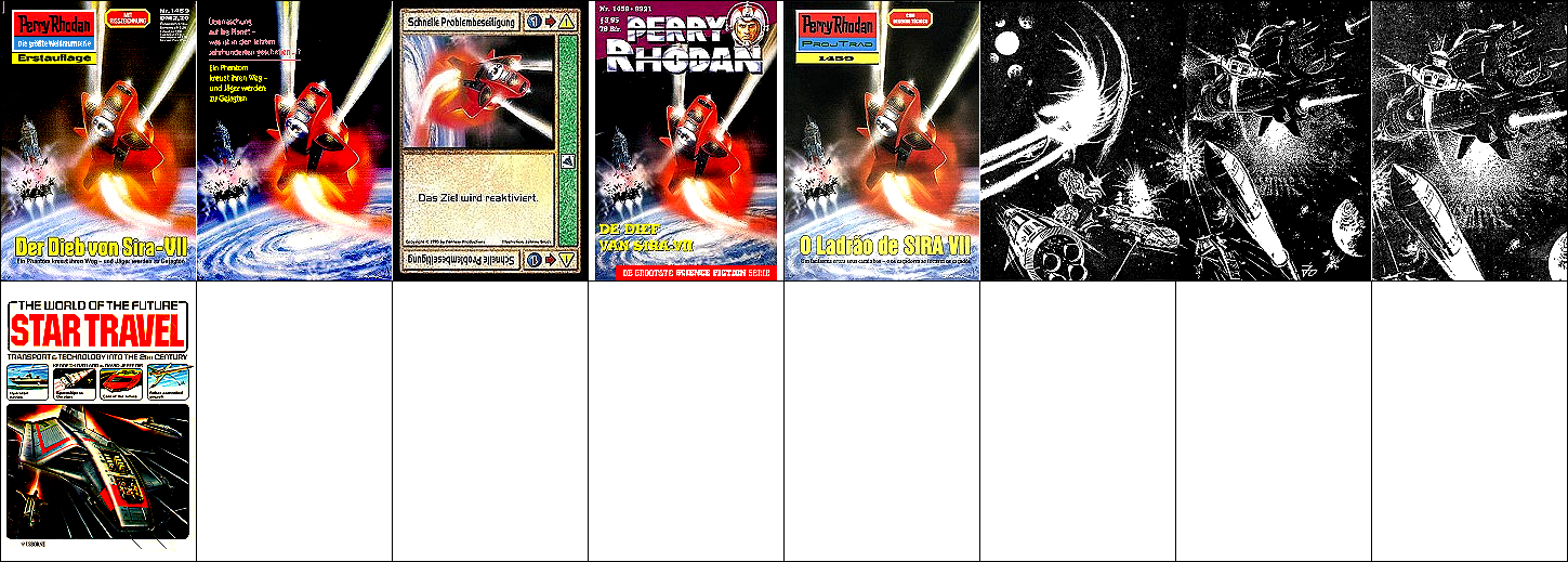 1 - 5 gleiches Bild, 3 Ausschnitt, gedreht, ein ähnliches Raumboot kommt auch in 6 vor und ist von 8 inspiriert bzw. in 6 davon nachgezeichnet |