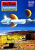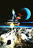 Raumschiff über schneebedeckten Bergen, am Horizont 2 Planeten |