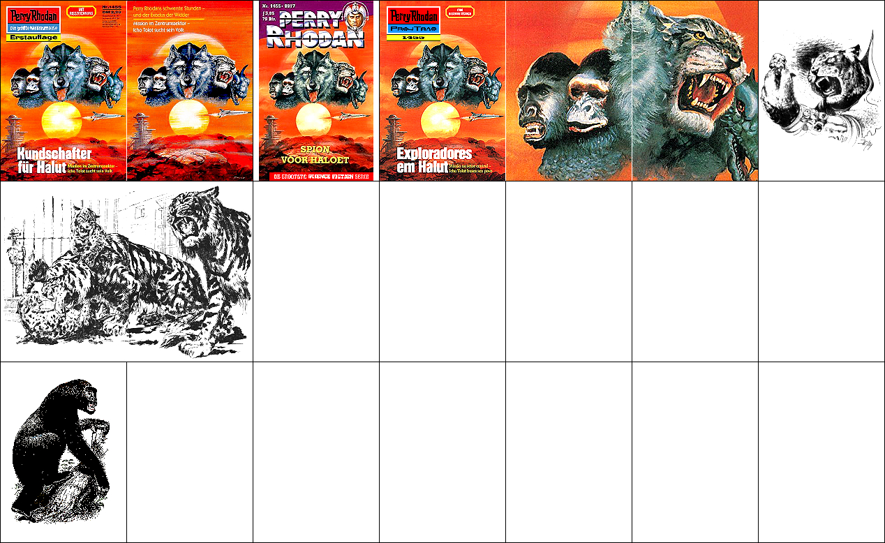 1 - 4 gleiches Bild, der Kopf des Affen links ist von 15 nachgezeichnet, das Katzenwesen rechts taucht auch in 7 und 8 auf |