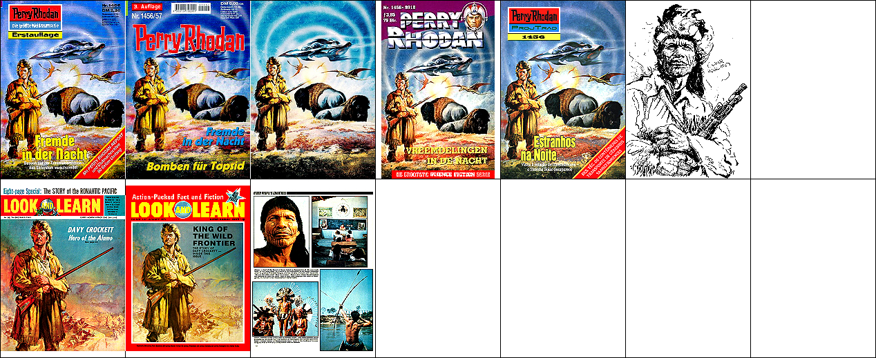 1 - 5 gleiches Bild, der Trapper in 6 ist ähnlich dargestellt, der Mann in 1 ist aus 8 bzw. 9 entnommen, 10 ist das Vorbild für das Gesicht des Mannes in 6 |