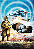 2 Menschen mit Federkopfschmuck vor abgestürztem Raumboot |