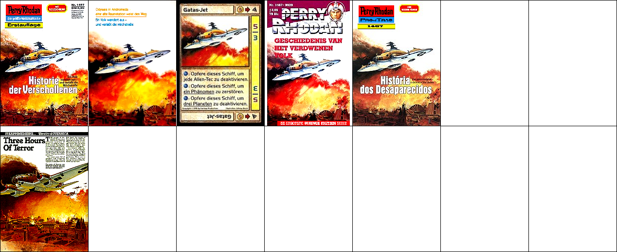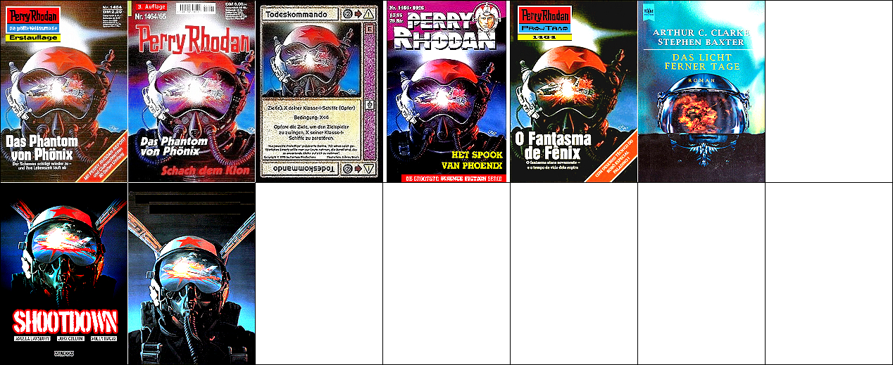 1 - 5 gleiches Bild, 6 sehr ähnliches Motiv, 8 bzw. 9 Vorbild für Nachzeichnung in 1, gezeigt wird eine Szene aus dem Film "Shootdown" (Flug ohne Rückkehr) |