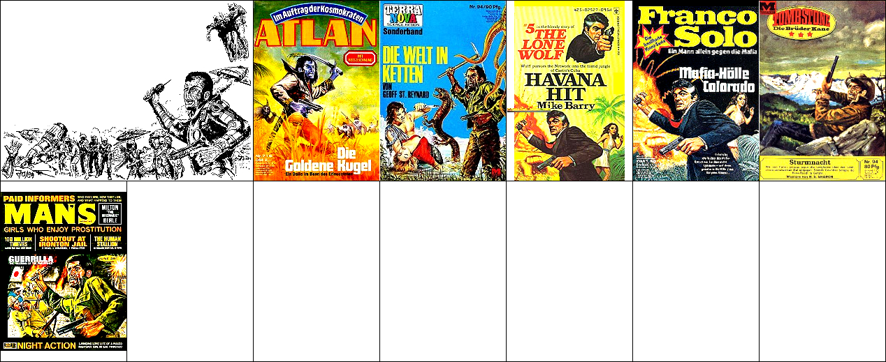 gleiche Körperhaltung, 2 seitenverkehrt, restliches Bild unterschiedlich, von 8 nachgezeichnet, das Motiv von 8 wurde vom Zeichner auch in 4 verwendet, 5 ist davon nachgezeichnet bzw. sogar teilweise einmontiert, der Kopf des Mannes taucht auch in 6 auf |