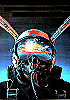 Mann mit Raumhelm, in dessen Brille sich ein explodierendes Flugzeug spiegelt, siehe auch