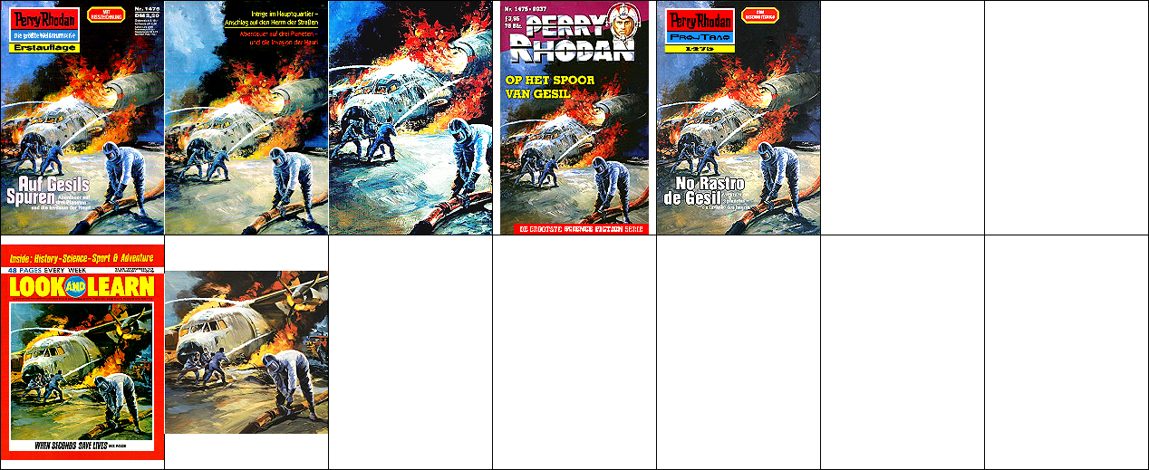 1 - 5 gleiches Bild, die Szene mit Flugzeugwrack und Rettungskräften ist von 8 bzw. 9 nachgezeichnet |