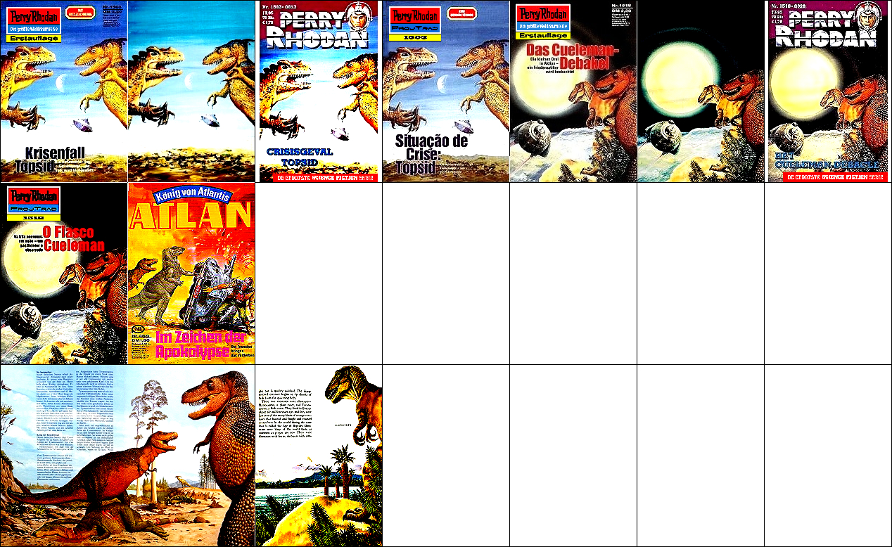 ähnliches Motiv, 1 - 4, 5 - 8 gleiches Bild, der rechte Saurier in 1 und 5 ist von 15 nachgezeichnet (1) bzw. als Collage entnommen (5), der linke Saurier in 9 ist ebenfalls ähnlich wie in 1 und von 15 eingeklebt, der hintere Saurier in 5 ist von 16 übernommen |