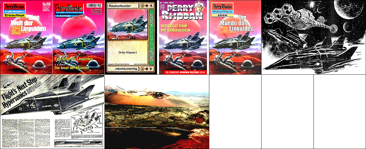 1 - 5 gleiches Bild, 3 Ausschnitt, in 6 sehr ähnliches Raumboot, 8 Vorbild für das Raumboot, 9 für den Hintergrund, der den Vulkan Timanfaya auf Lanzarote zeigt |