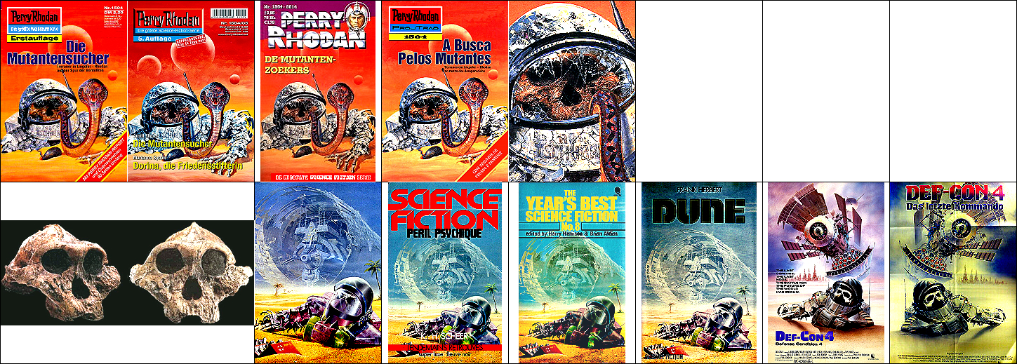 1 - 4 gleiches Bild, der Skelettschädel ist vom Menschenvorfahren in 8 entnommen, das Motiv mit dem Raumfahreerkopf könnte von 9 beeinflusst sein, 9 - 12 gleiches Bild, auch 13 bzw. 14 zeigt ein sehr ähnliches Motiv |
